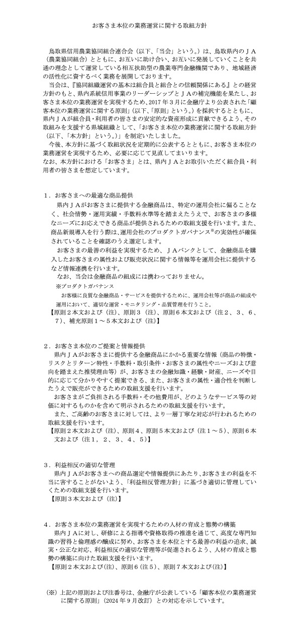 当会は、農業協同組合法その他関連法令等により営む事業の利用者(利用者になろうとする者を含む。以下同じ。)の正当な利益の保護と利便の確保のため、以下の方針を遵守する。また、利用者の保護と利便の向上に向けて継続的な取組みを行っていく。